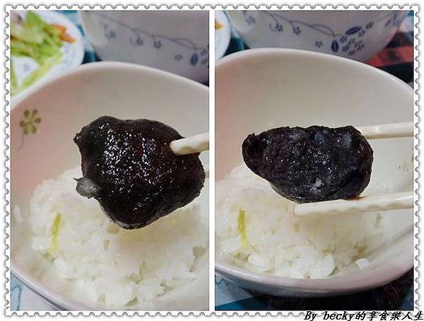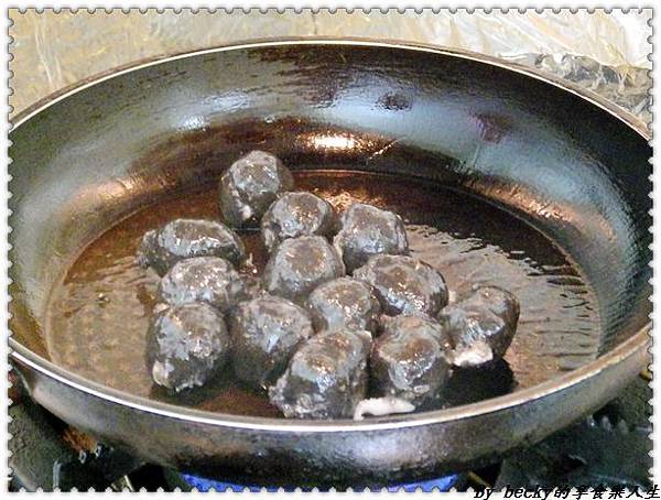 再來是煎的墨汁墨魚魚丸~這個是用花枝及墨魚粉與上等魚漿混合製成的,別看它黑麼麼的一塊,裡頭的墨魚非常有彈性,吃起來還有Q彈的JUCIE味道,有著鮮美的甜味,香濃Q彈好味道,這樣子可以吃的到海味喔!
