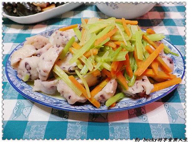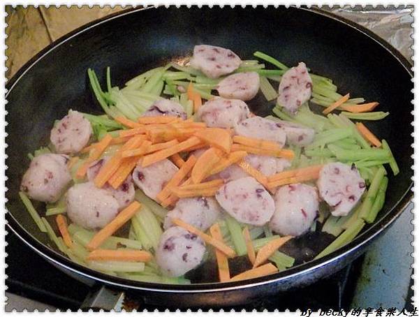另外的墨魚八爪魚丸來與芹菜與紅蘿蔔一起炒,吃起來有著Q彈口感,且在口中咀嚼有著章魚、花枝與魷魚多汁味道,拿來與青菜拌炒也是很美味咧!