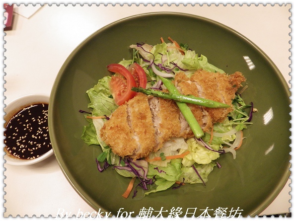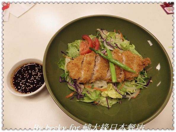 再來主餐上桌了~我點的是紅味噌炸豬排飯:飯上面鋪著滿滿的生菜,吃一口鮮脆爽口,且也有鮮紅的番茄及翠綠的蘆筍,配色很棒,連營養都有顧慮到。