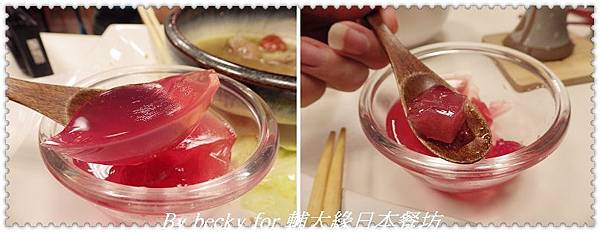 果凍是由甜菜根加寒天製做而成的,也是老闆娘親自熬煮成的,她說這甜菜根是對人體很有幫助,所以除了美味外,也要讓客人吃的營養及安心。