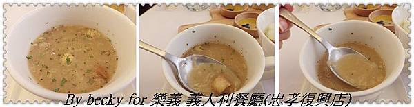 洋蔥湯部份店員事先有先問可否吃牛,表示裡頭加的應該是牛肉,果不其然,喝了一口,可以嚐到濃郁的牛肉味道,裡頭加有小塊的麵包塊,咬起來脆脆的,濃郁的湯頭配上麵包塊,非常搭配,這道湯品我很喜歡。