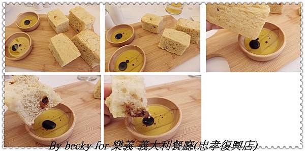 義大利麵包部份搭配的橄欖油+紅酒醋;麵包口感外面烤的硬硬的,但裡面卻是很柔軟,單吃可以吃到原味麵包的香及Q感,沾了醬汁,有著酸酸的口感外,還帶些橄欖油的香氣,只是我比較不愛偏酸的口感,但朋友卻很愛的這類的味道,只能說每個人的口感皆不相同。
