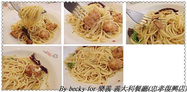 送上時,我有點小傻眼,因為大多去的餐廳,那個麵條都是捲的高高的,但眼前這盤義大利麵有點小團及壓扁的感覺,捲了一口麵條吃入口中,麵條雖是有Q彈感,不過卻帶點硬實感,因為是香辣椒,所以有點小微辣感,配上除了炸的蒜頭外,還有小蒜頭塊,所以吃在嘴中都是蒜頭味居多,這個我比較不愛;至於雞肉部份,真的可以稱讚,因為入口後非常鮮嫰多汁,還保留著肉汁的口感,美中不足的是只有三塊~吃不夠啦!
