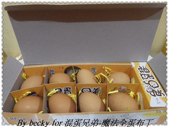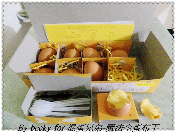 再來入眼的就是8顆雞蛋,排列的很整齊,最裡面放的是蛋托的紙,最旁邊的小盒則是焦糖漿及小湯匙。