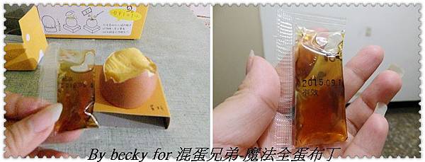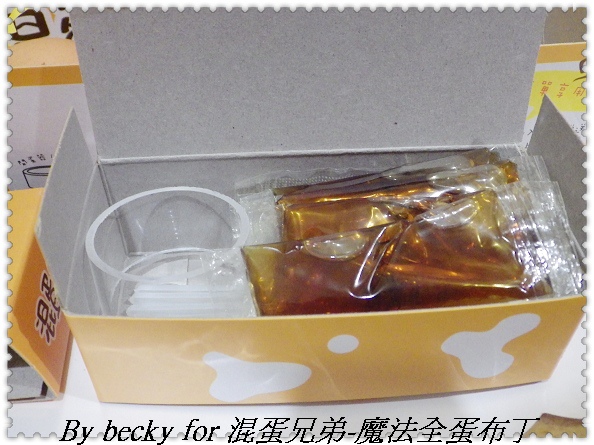 小盒子打開後,有看到一個小小的塑膠圓環,是要碎雞蛋用的,然後就是焦糖包及小湯匙。
