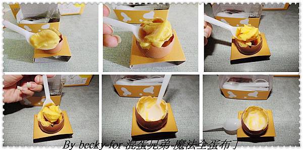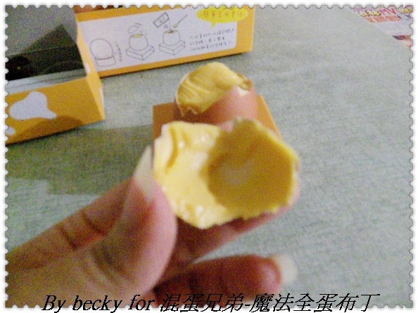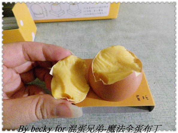 因為要試吃的那顆雞蛋已經裂了,所以用手一剝就開了一小塊,看起來真很像結實的布丁。