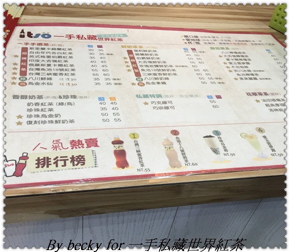 在未選擇品項之前,我先問了老妹,那種比較好喝~結果她唸了一堆,我只聽到了魚池二個字,所以丫~站在櫃台前,就點了台灣魚池18號紅茶及三峽蜜香鮮奶茶,因為看到第一名招牌茶飲是三峽蜜香紅茶,因已經點了18號紅茶,於是轉換一下改成鮮奶茶。
