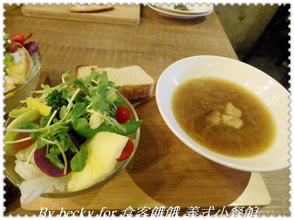 湯品則是洋蔥湯,裡頭有著麵包塊,喝了一口,味道很香濃,裡頭有著大量的洋蔥,且還有加入一些大蒜,所以味道更是濃郁及鮮甜,而麵包部份是店家現烤及現切,吃的內軟外酥的口感,裡頭還有著應該是藍莓果乾,味道更是香,搭著洋蔥湯吃口感更是棒。