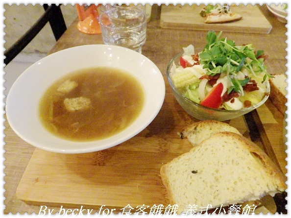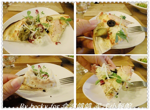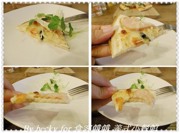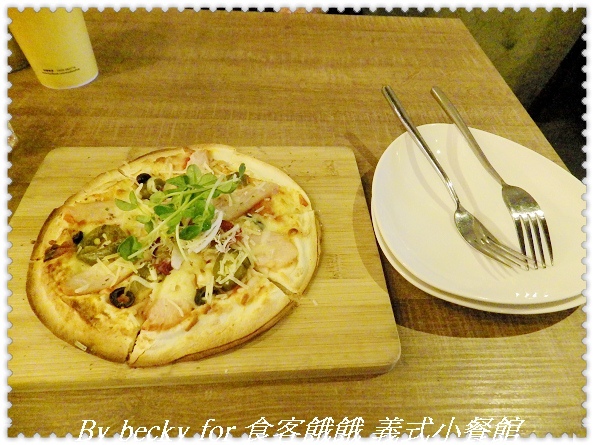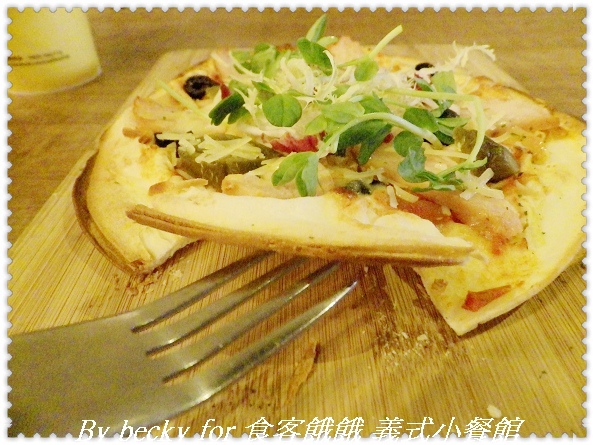 等了一下,先送上來的是義式意思燻雞薄餅披薩,本來還以為應該是沙拉或是湯品先上桌,不過PIZZA先送上桌後,還是要趁熱吃才行。