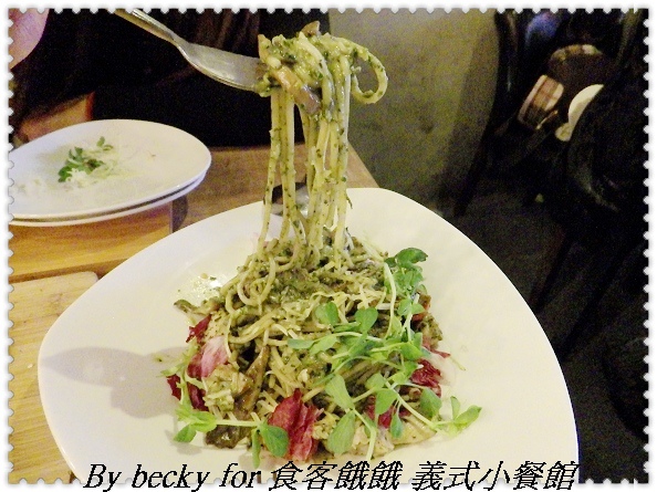 麵條的口感有些硬,不過還蠻順口的,九層塔的青醬口感很濃郁,除了生菜外,還有一些菇類,吃起來很脆且味道重,裡頭的雞肉有些鬆軟,整個吃起來味道還不錯,老妹選的比較偏健康養生類的。