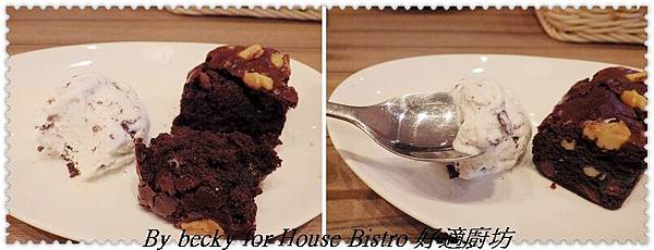 送上來時布朗尼是熱騰騰的,搭配著旁邊的巧克力脆片冰淇淋,布朗尼裡頭有著核桃果,搭配著吃很脆香,雖然是熱騰騰的,但卻是很甜膩,配著冰淇淋吃可以沖淡一些甜味,但還是很甜。