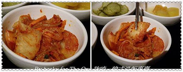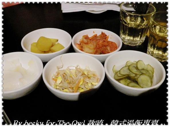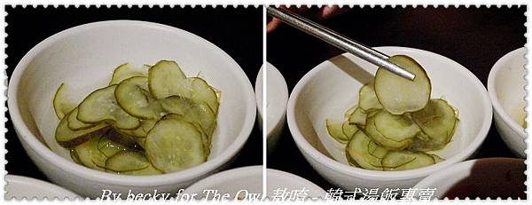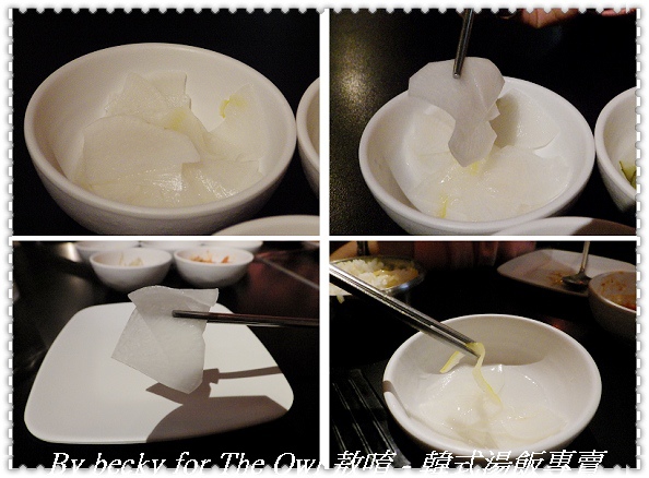 通常韓式小菜都是可以續盤的,店家也不例外,每一種先來試吃看看:蘿蔔的口感應該是醃物的,雖然很脆,但有些酸,對了~裡頭有著柚子絲,所以吃來帶有點甜味。
