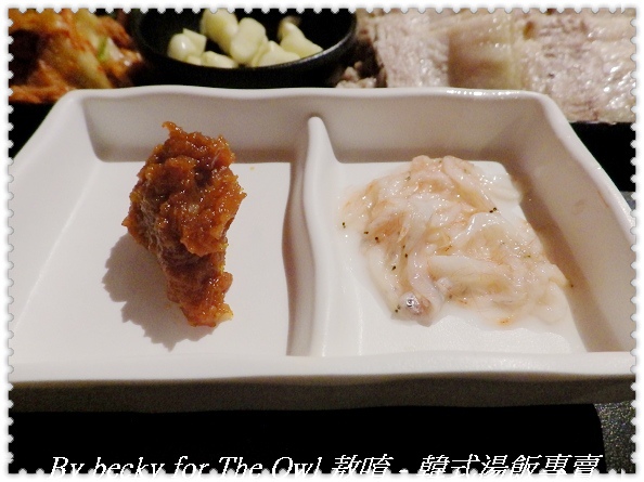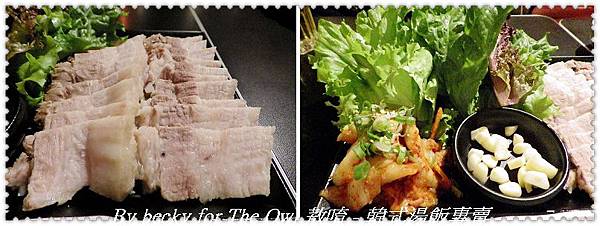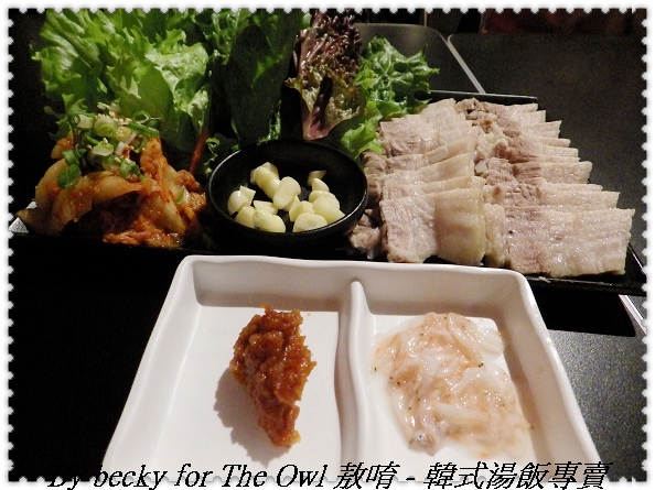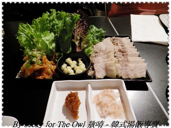 生菜包五花則是有生菜及豬五花肉,旁邊則是泡菜及蒜的搭配,五花肉部份店家只有川燙而已,所以送上來時,店員就教導如何吃,當然也介紹了醬料的搭配使用。