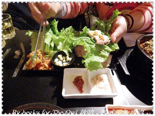 朋友很勤勞的幫忙包,所以就讓她服務了;首先,拿了一片生菜,放上了一塊五花肉,再加上辣醬及泡菜及蒜頭,再夾了二”隻”蝦子,沒錯~不用懷疑,真的是二隻,因為店員說會很鹹,所以只夾了二隻,完成後整個塞進嘴裡,哇!所有味道在嘴中散開,有生菜的脆、五花肉的香及嫰、辣醬、蝦醬及泡菜的味道混合,有微辣及微鹹的口感,再加上蒜頭的"陪稱",咀嚼後整個味道久久不散,真的很好吃。