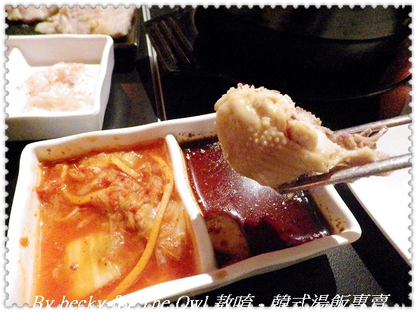 最後吃的是半隻雞~這個套組也有沾醬,當然也有小菜-泡菜,醬料是店家自製的:裡頭有醬油、醋、辣椒醬及芥末,另外也有附上鹽罐。