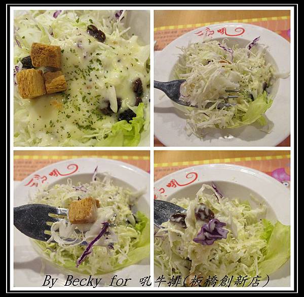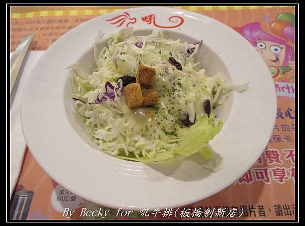 而先送上的是生菜沙拉,這個可不是吃到飽,而是一人一盤,這個沙拉裡有著高麗菜絲、葡萄乾及麵包丁,上面淋著店家特製的沙拉醬,看起來很不錯。