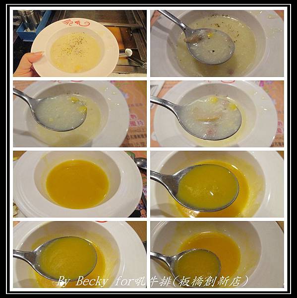 而湯品有玉米濃湯及南瓜濃湯二種:玉米濃湯的料有玉料及火腿、還有菇類,這個比較特別點,聞起來味道很香,入口後很濃稠,味道還不錯,而南瓜濃湯部份感覺是南瓜泥去熬煮,雖然味道很濃稠,卻沒有南瓜的香味。