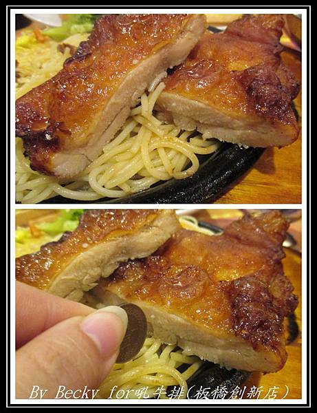 鐵盤上有著麵條、蛋、少許的蔬菜及雞腿排,腿排從中間切開,可以看的出來其厚度,它的厚度跟1圓的硬幣一樣,份量十足。