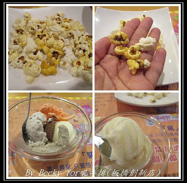 爆米花是奶油味,味道很香濃,不過有些爆的不均勻;而冰淇淋部份有草莓、香草、巧克力、芋頭及瑞士巧克力(猜測的),每一種有都些偏甜,口感還好;而霜淇淋部份,口味是香草,這個吃起來就很滑順,入口後還帶著牛奶的香味,這個我還蠻喜歡的。