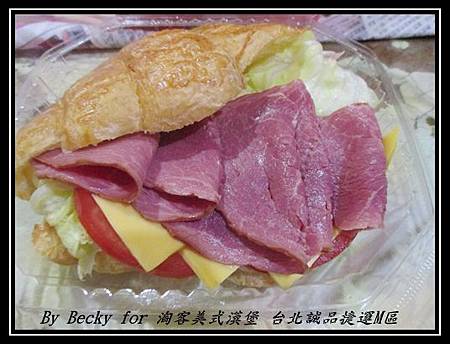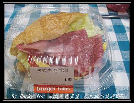 份量十足,給料很大方,牛肉有5大片,這份法式牛肉可頌也是可以看到每一層的食材:可頌麵包、燻牛肉、起司、番茄及生菜等,膨鬆的外皮可頌,拿起來一壓就扁了,可以知道多鬆軟,咬一口,番茄及生菜的新鮮可以稱出燻牛肉的味道,牛肉的味道有點偏鹹,整個入口後,帶些微香及脆及鹹在嘴巴融合,很適合當夏季的輕食,非常不錯!