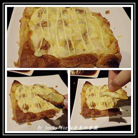 這個送上來我還看了一下,因為完全顛覆了PIZZA的思微,底下的餅皮竟然是起酥皮,上面的白醬中有著雞肉及玉米的混合,有著非常香的味道,因為是起酥皮,所以烤出來是四邊很酥脆,中間很薄。