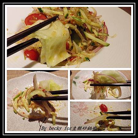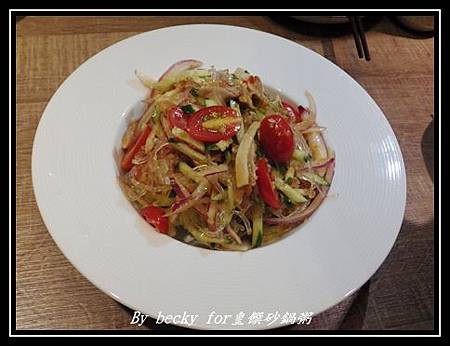 這道泰式寒天雞絲送上時有聞到泰式醬汁的味道,裡頭有雞腿肉、紫洋、黃瓜、小蕃茄及寒天;夾了一些入口,各種食材的混合,雞肉的鮮嫰、洋蔥及黃瓜的清脆、小蕃茄的多汁及很咕溜的寒天,味道十分融和,而往裡頭夾時,發現到了生菜,整個吃起來就是酸甜微辣又帶點清爽感,十分開胃。