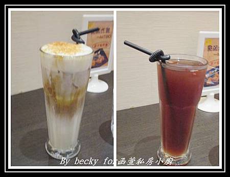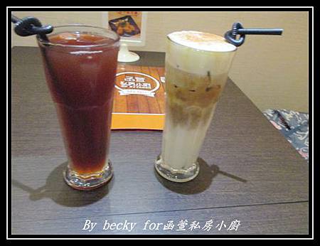 在吃的同時,飲料也送上來了~朋友點的拿鐵,幫我點的是酸梅汁;拿鐵部份是呈現二種分層,因沒加糖,喝起來有些微苦,不過很香醇,帶些咖啡香,我的酸梅汁是店家自己特製的,味道不會過於甜膩,很爽口,可以的話,我還想多來幾杯,味道十分好。