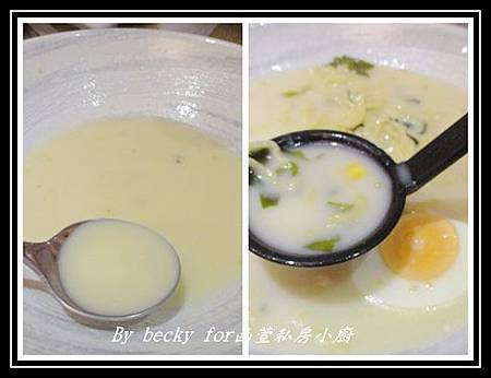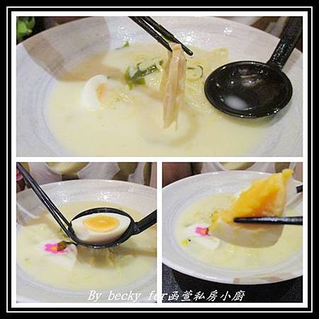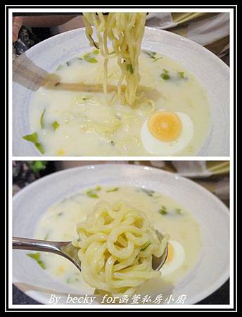 拉麵部份:裡頭有筍絲、海帶芽、海苔絲、玉米及半顆熟蛋,朋友吃了一口麵條說似乎有些略硬,我吃了一口,其實還行,只是彈性度不夠,不過也很不錯。