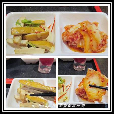 而小菜則是豆干及泡菜:豆干的味道調製很入味,吃起來很嫰,帶點甜味;而泡菜則是脆脆又帶些酸辣,也很適合配飯及配麵。
