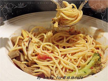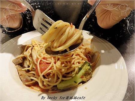 而義大利麵部份,濕度剛好,麵條軟硬適中,沾著濃郁又多的蕃茄肉醬,朋友說吃起來很順口,一口接著一口非常入味好吃。
