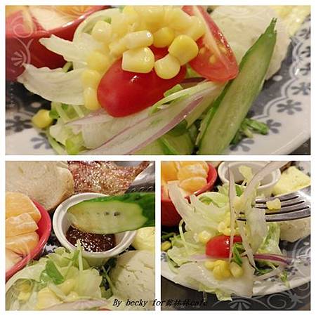 這個早午餐有沙拉、水果、芋泥球、歐姆蛋、軟法麵包加奶油及雞腿排;沙拉裡包含著小黃瓜、蕃茄、玉米、洋蔥、生菜及綠豆苗,