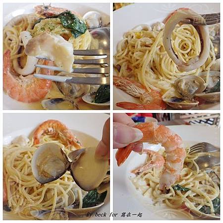 奶油海鮮義大利麵裡有各式海鮮:蝦子、花枝、鯛魚片及蛤蜊,還有九層塔、彩椒及菇類,而上頭有灑著起司。