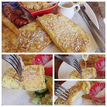 鮮奶法國土司則是很柔軟,沾著蛋汁下去煎,上面有灑著糖粉,單吃有著微甜的口感,若是淋上蜂蜜則是很帶著甜蜜的味道。