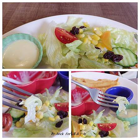 生菜沙拉裡有生菜、葡萄乾、新鮮蕃茄、彩椒、小黃瓜及玉米,單吃都很新鮮及清脆,都帶有水份,而店家附的醬汁是特調的檸檬汁醬,沾著吃非常清爽又美味,朋友直說好吃!