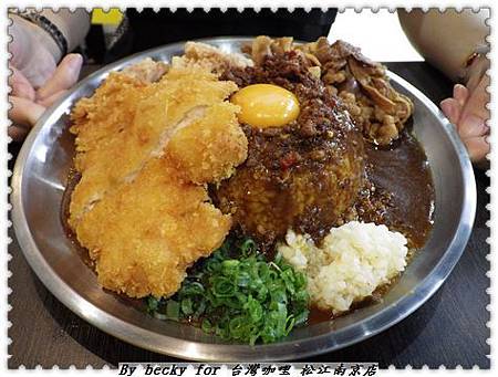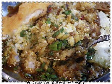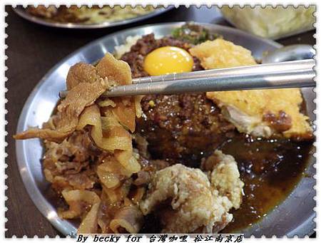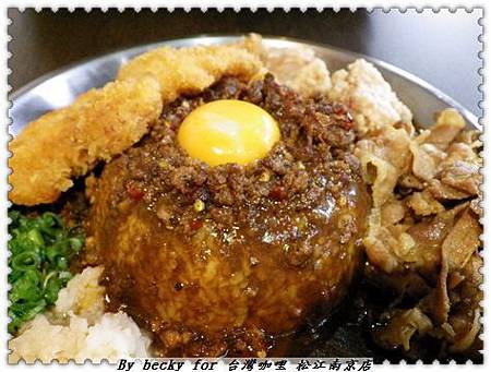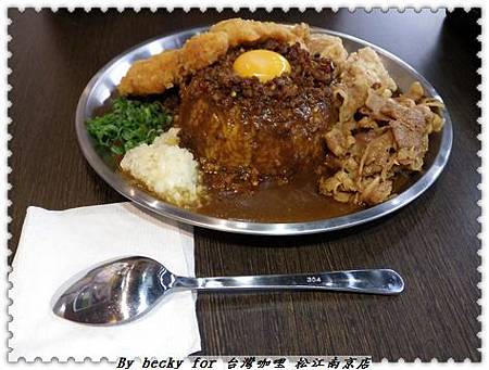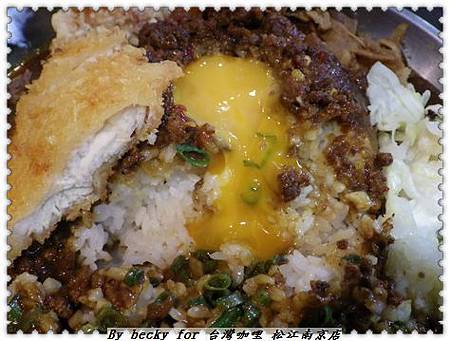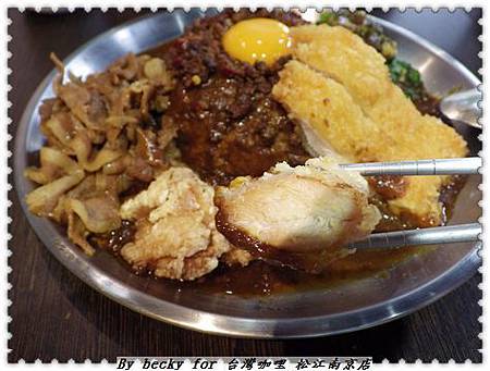 綜合台灣咖哩飯~這是店長推薦的,通常不知道如何點餐的,店長都會推薦這道,沒錯~這可以享用到三種主食-涮豬肉、炸雞、炸豬排,在中間有著滿滿的肉燥的咖哩飯,還有一顆生雞蛋,整個讓人很驚嘆。