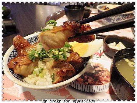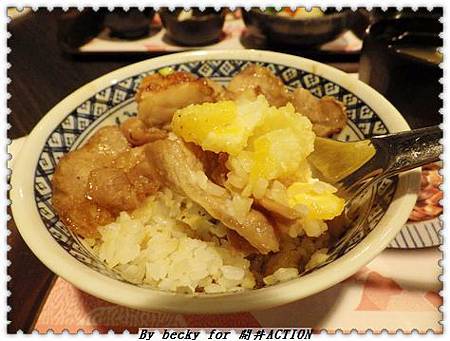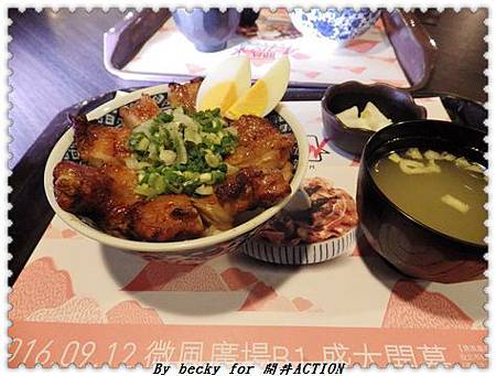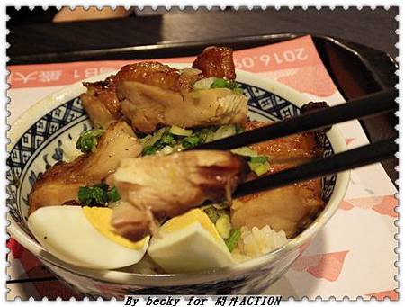 上面佈滿了切塊的雞腿丼,再半顆的水煮蛋,還有青蔥,雞腿上面油亮油亮,香味撲鼻而來,夾一塊雞腿肉,可以看到豐富的油脂。