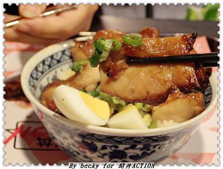 把蛋戳破後,黃澄澄的蛋黃流下來跟燒肉混合,咬一口燒肉,肉質Q彈滑嫰,略重的醬汁並不會死鹹,非常好吃。