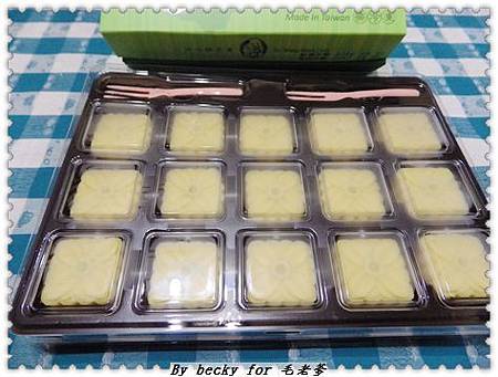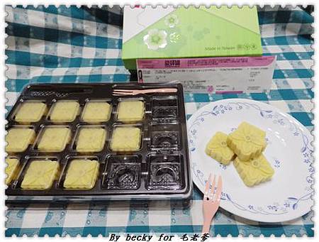 撕開後,有著花紋圖案、方方正正黃綠的綠豆皇映入眼中,讓人更稱讚的是還有一層透明塑膠殼保護著。