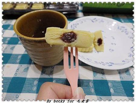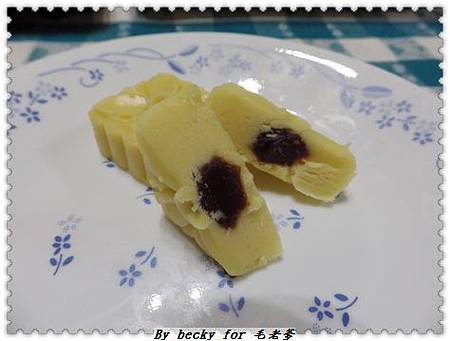 拿一塊對中切開,在中間的有著紅豆內餡,少許的內餡帶點微甜味道。