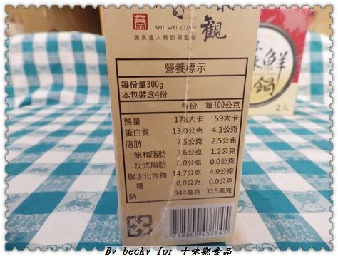 這次吃到十味觀冷凍-麻辣鍋鮮鍋及常溫的四神湯,包裝及說明都非常仔細,食材及味道也很好,不管是全家人或一個人都是可以好好的享受品嚐的,除了麻辣鍋鮮鍋及四神湯外,十味觀也是有其他的產品,有機會再試試其他的味道。(以上為個人實際吃食後的感想,僅代表個人之意見)