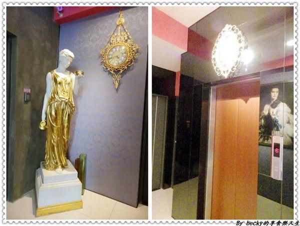 越過了交誼廳就可以看到電梯,聽小管家說每一層的佈置完全不同,所以我們決定先放下行李後,再慢慢參觀,這是一樓的電梯處,佈置的很古典。