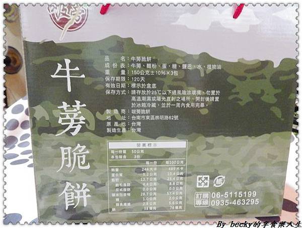 這次吃到了啵蒡脆餅的牛蒡餅乾,吃時完全沒有油膩感,而且還可以依照自己喜好的口味來調味,有些人不愛牛蒡的特殊味道,但啵蒡脆餅的脆餅可以用調味粉來讓餅乾更美味,除了好吃外又健康,個人我蠻推薦啵蒡脆餅,下次要來試試其他口味。(以上為個人實際吃食後的感想,僅代表個人之意見)