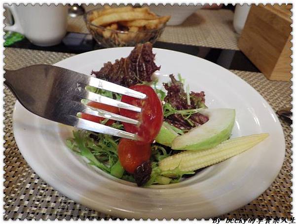 沙拉裡頭有著小蕃茄、芭樂、玉米筍、生菜及葡萄乾等等;水果吃起來有水份及清脆,生菜新鮮,淋上和風醬汁帶著微鹹微酸味,吃起來很爽口。