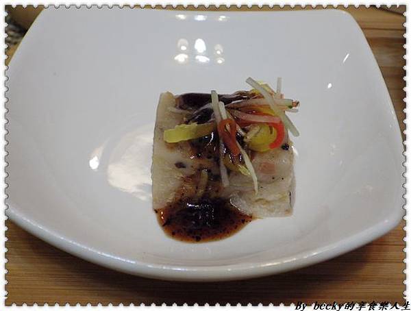 先來品嚐松露蘿蔔糕,小巧玲瓏的,真的是可以一口食,上頭有著松露醬汁及彩椒配,切一半入口,裡頭有著一絲絲的蘿蔔絲,搭配醬汁有著微甜鹹口感,整個香氣充斥口中,朋友說有吃到核桃,帶有脆脆口感。