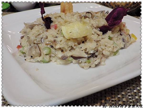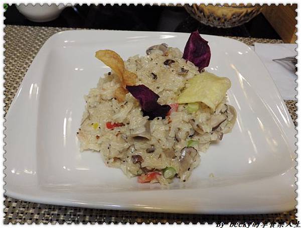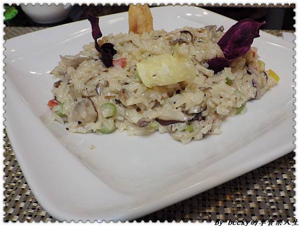 我點的野菇燉飯~旁邊用炸地瓜片當點綴,光光看就很養眼。