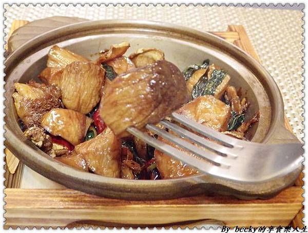 朋友點的三杯香炒杏鮑菇裡頭有杏鮑菇、猴頭菇、九層塔、紅棗及薑,這道味道很濃厚,杏鮑菇吃起來非常脆實,很有咬勁,很適合下飯。
