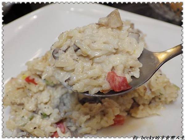 燉飯裡頭有各種菇類:香菇、蘑菇等等,還有切小塊的蘆筍、切小片的彩椒,舀一匙入口,味道濃香,咀嚼在口中有各種食材的鮮味。