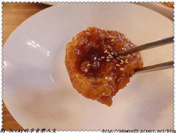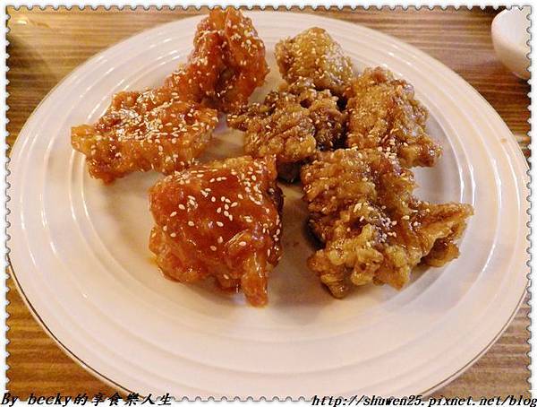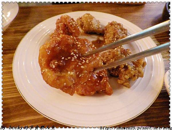 韓式招牌洋釀~是店裡有名氣的必點之一,洋釀就是韓式甜辣醬,帶點輕微的辣度,炸雞包裹著洋釀醬,上頭灑上白芝麻來增添香氣,起來微辣,還帶肉汁,整個是停不了口的過癮。