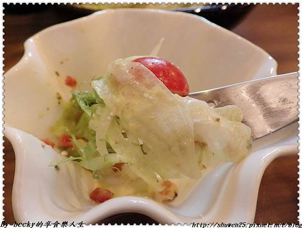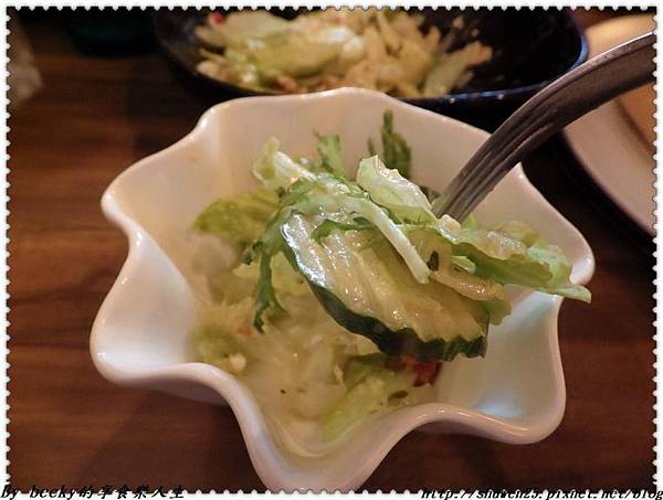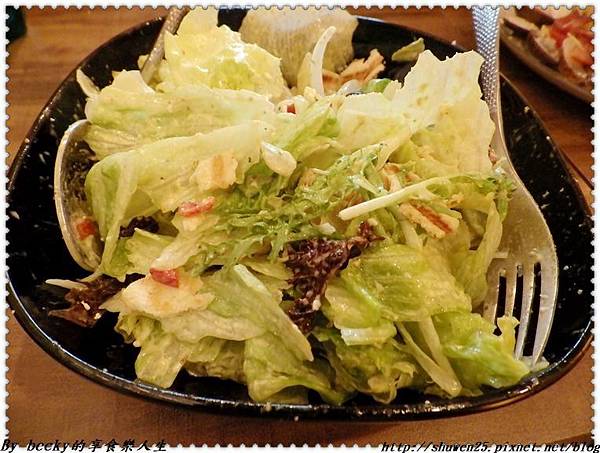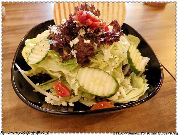 裡頭有羅蔓、美生菜、洋蔥及蕃茄等等,各種蔬果,與費達起司跟店家自製的蛋白醬混合,吃起來很爽口,一點也不油膩,入口有著新鮮脆甜的口感,大家都很推薦這道沙拉。