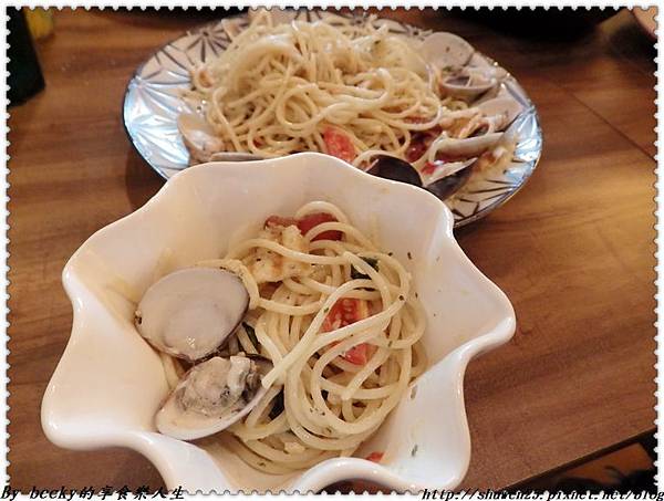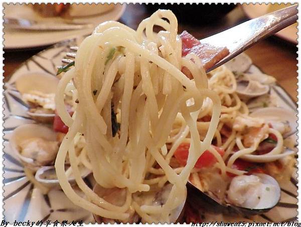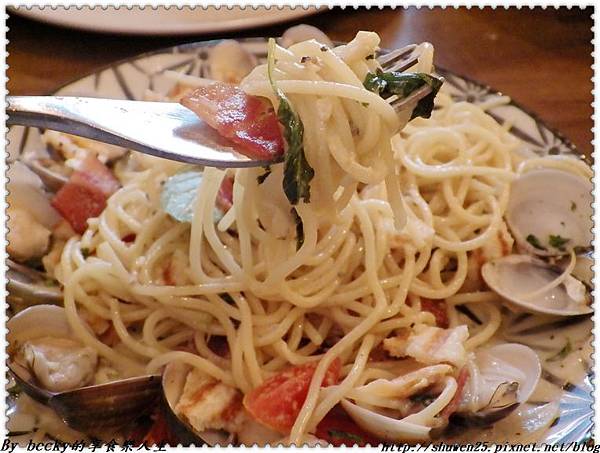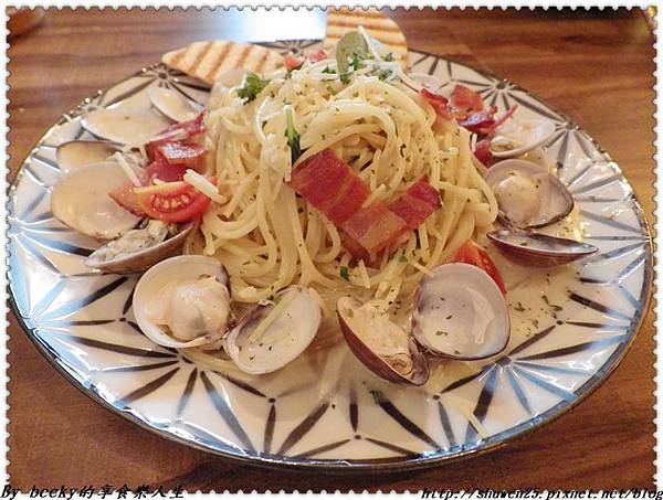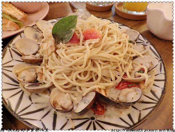 麵條帶點微硬感,白醬味道並沒有過多而有油膩感,而培根微鹹與麵條的搭配在口中很顯明,而每一口都可以吃到淡淡羅勒香,重點是蛤蠣都很大顆多汁鮮甜,光光吃就很有幸福感。